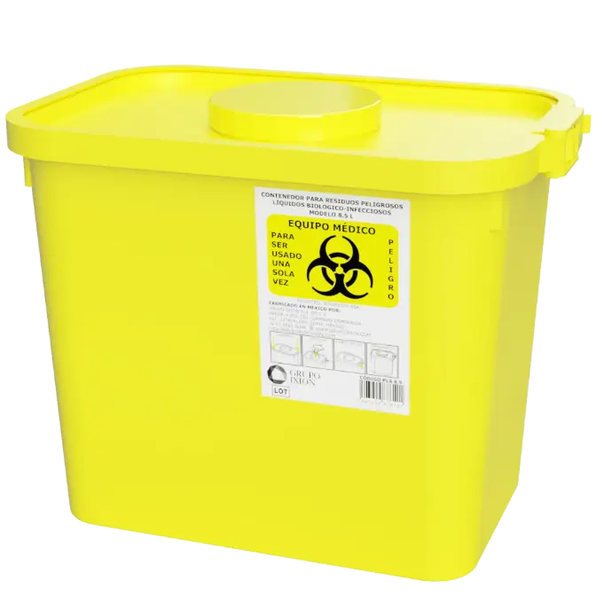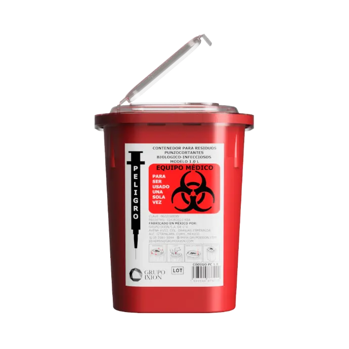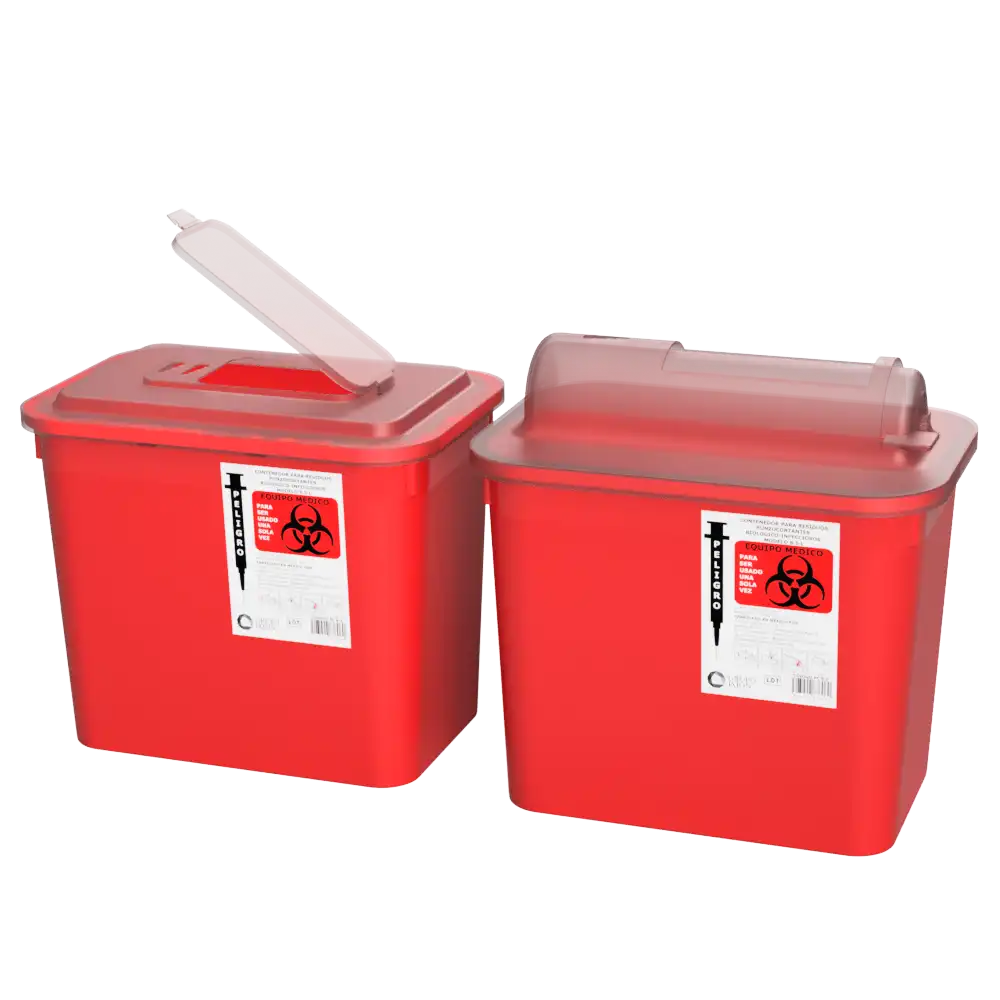 Para el desecho seguro de objetos punzocortantes. Con separador de agujas y tapa menor para el desecho seguro.